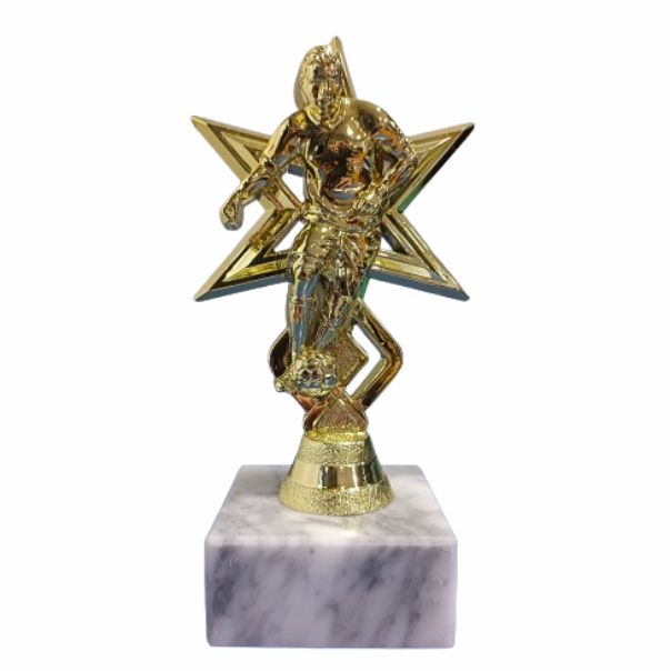 Trofeo figura fútbol de plástico en color dorado de 16,5 cms de alto.
